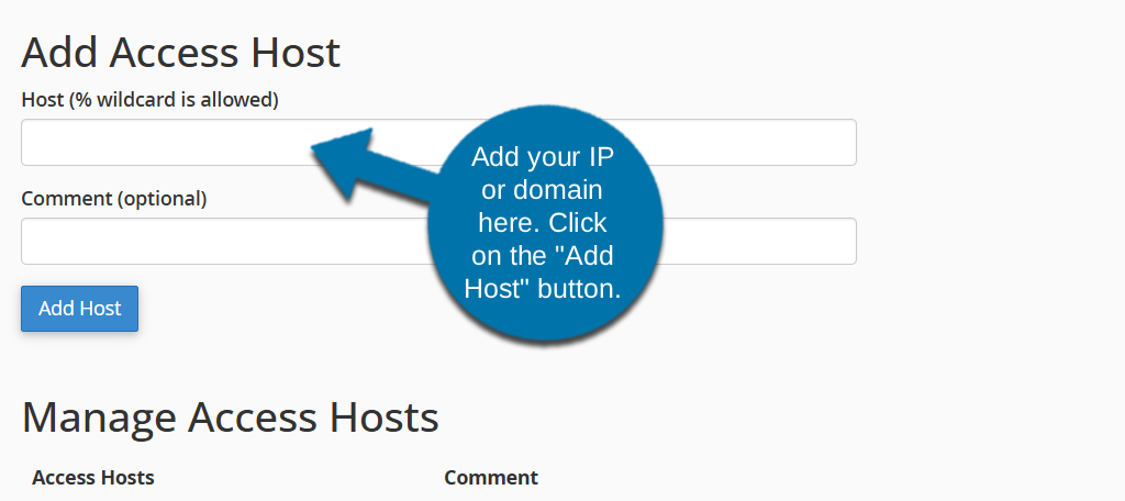 Note: When you first access the Remote MySQL section of cPanel, you may see an existing entry in the “Manage Access Hosts” section. Don’t delete that entry unless you want to disable localhost access to your database(s).