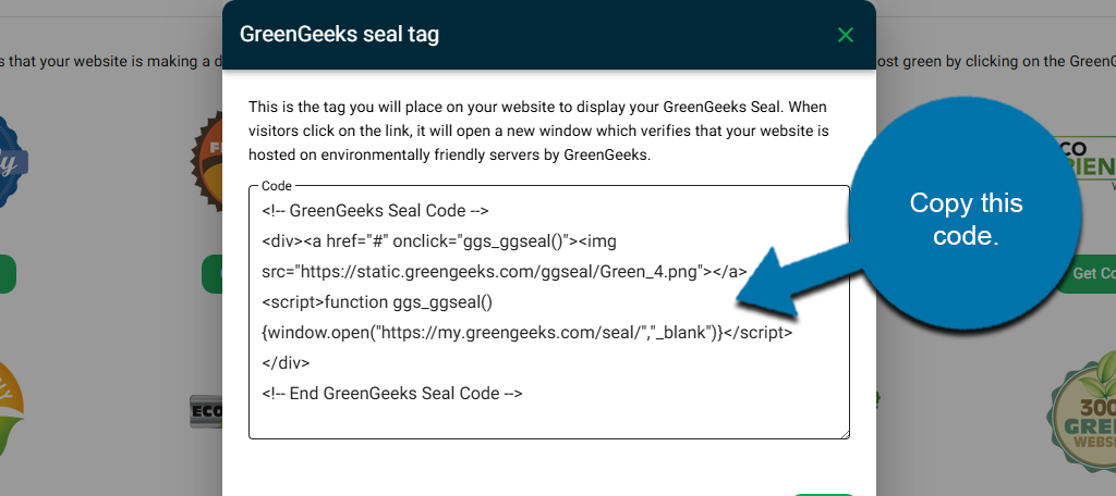 Upon clicking the Get Code button, a new window will appear with the HTML code. Copy this code to add it to your website.