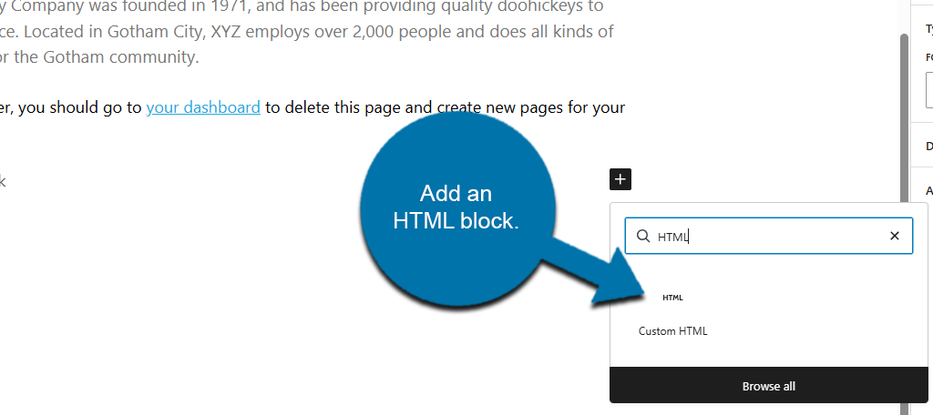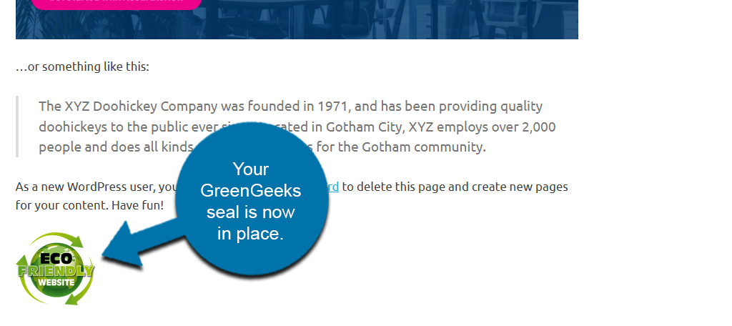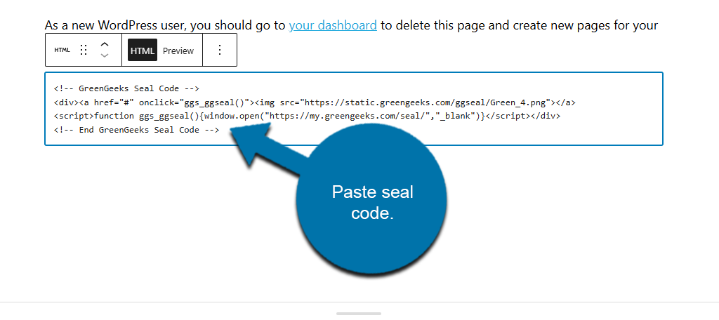 There are a few ways to add a GreenGeeks green website seal to WordPress: you can add it to a page, to a post, or in a sidebar or footer widget. The method is identical for each method. You just need to add an HTML block and enter the seal code in it.
