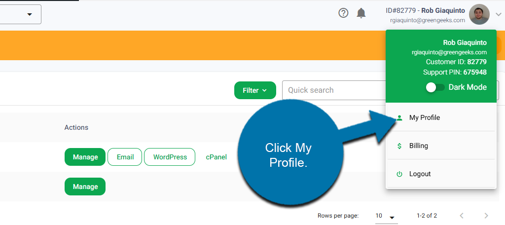 After logging into GreenGeeks, click the arrow from the top right and click My Profile.