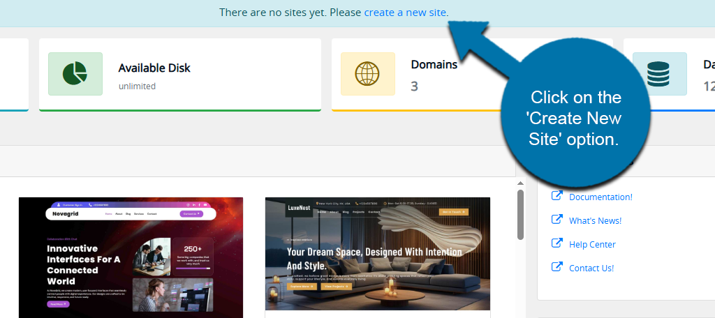 You will be taken to the admin area of the tool. At the top, click on the ‘Create New Site’ option to begin.