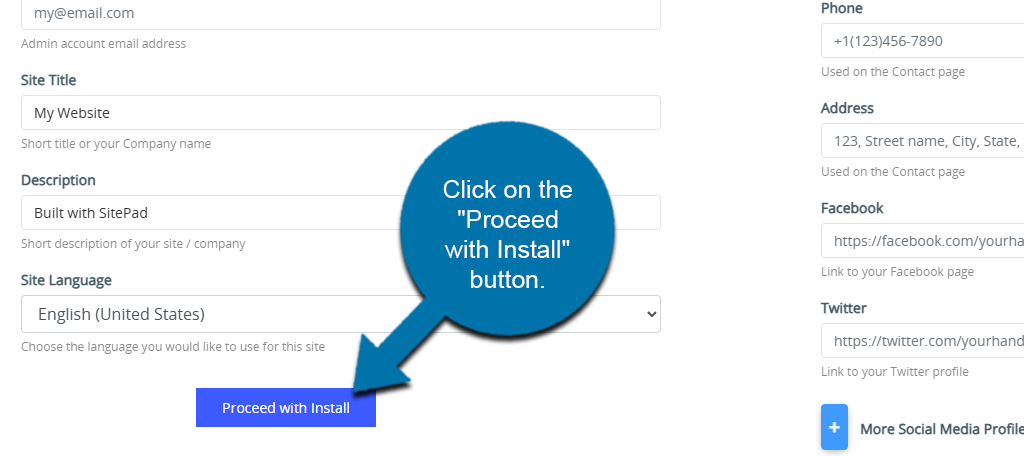 Next, you will enter all the site details. Then click on the “Proceed with Install” button.
