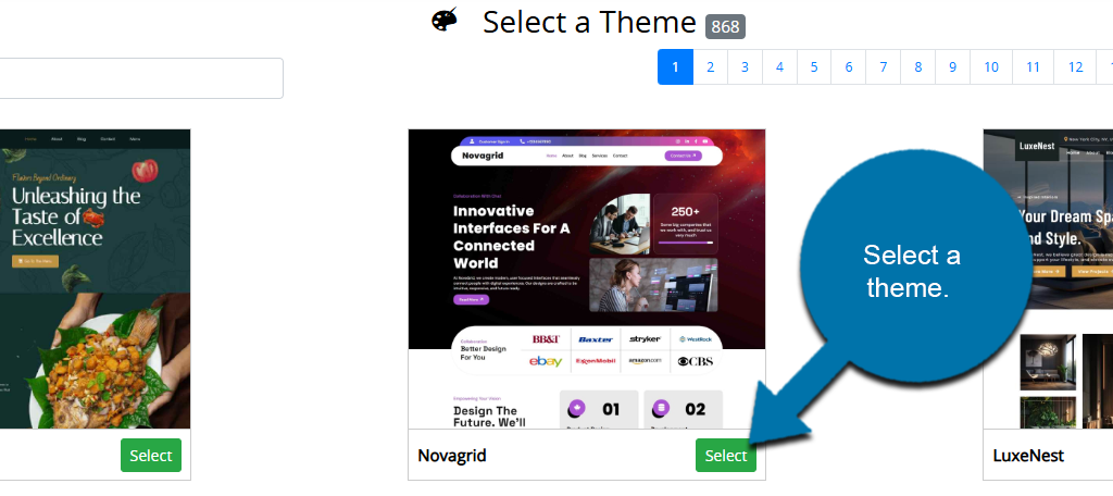 From here, you’ll be taken through a short setup wizard to get started. The first choice you will make is to select which theme to use in WordPress.