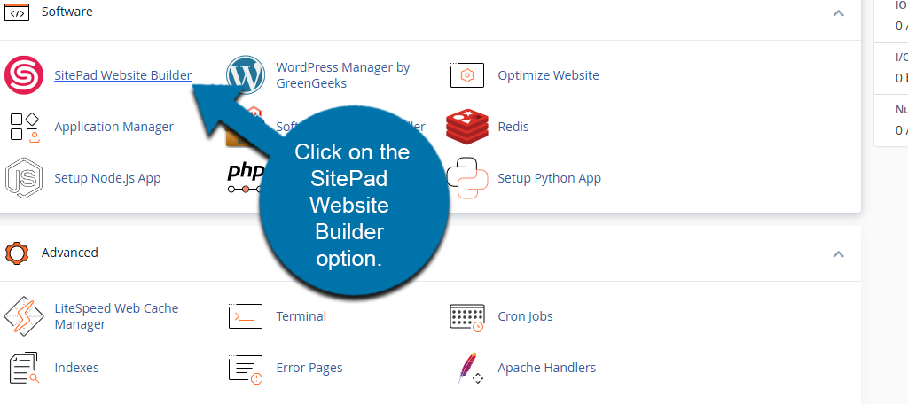 Sign in to GreenGeeks and access your cPanel. Inside the cPanel, scroll down until you locate the Software section. Click on the SitePad Website Builder option.