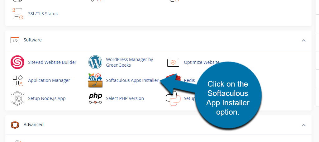 To find Softaculous, access your cPanel. Once there, locate the Software section and click on the Softaculous App Installer option.