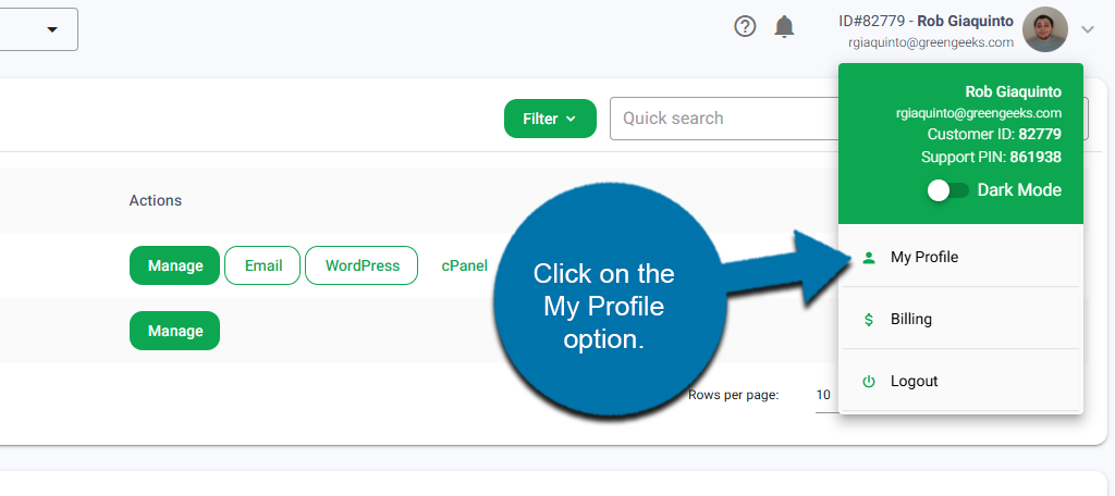 From your GreenGeeks dashboard, click your account information on the top right and click, “My Profile.”