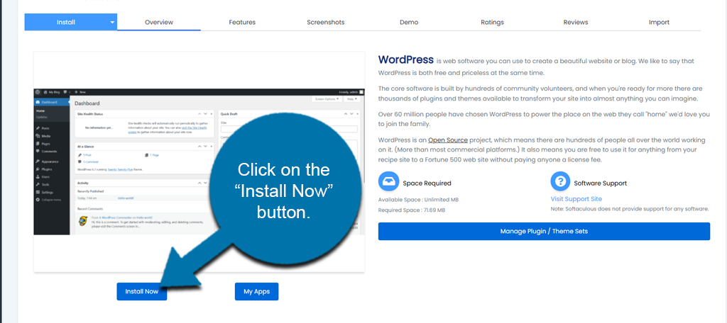 You will be taken to the one-click Softaculous installer. Click on the “Install Now” button to start the installation.