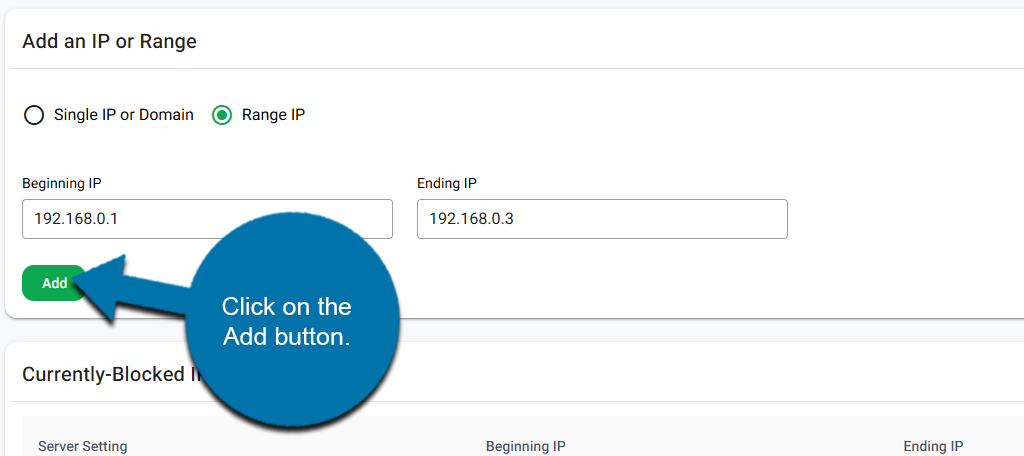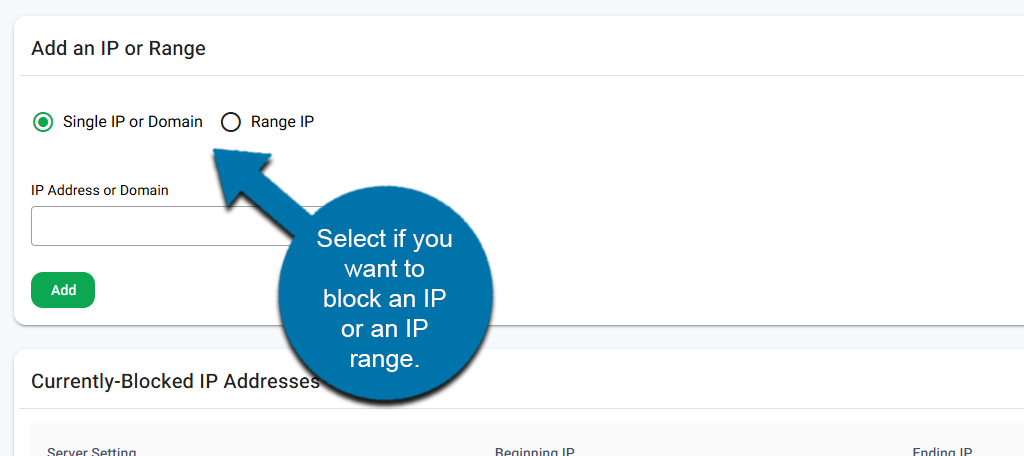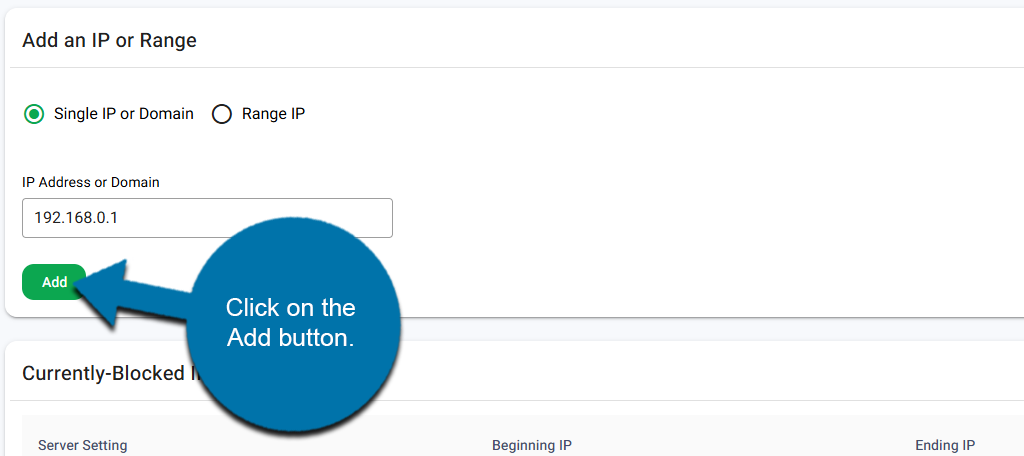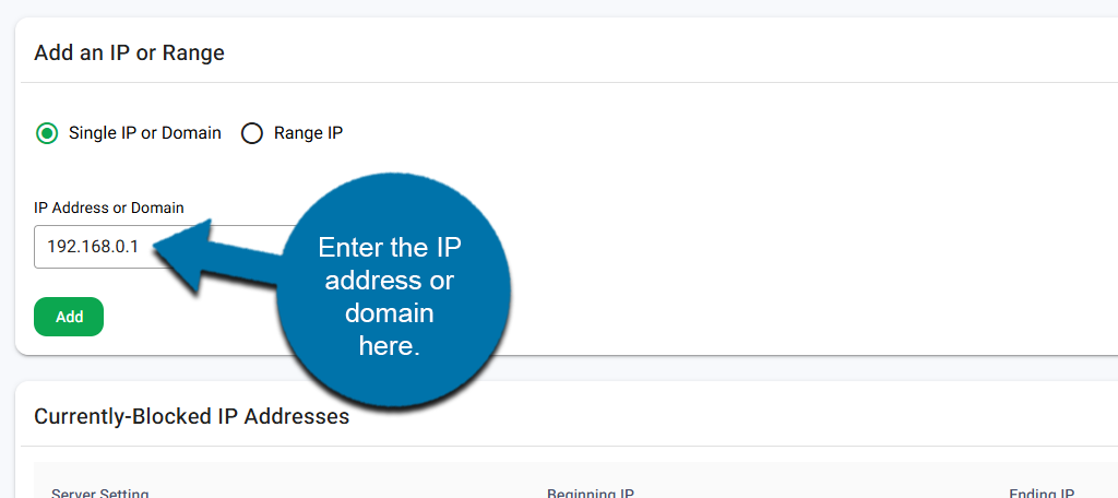At the top, you will see the Add an IP or Range section. Use the radio button to choose if you want to add a Single IP or Domain, or if you want to add a Range IP.