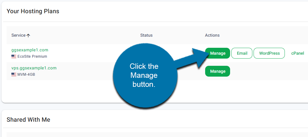 Start by logging into your GreenGeeks account. Locate the domain that you want to clock IPs on and click the Manage button next to it.