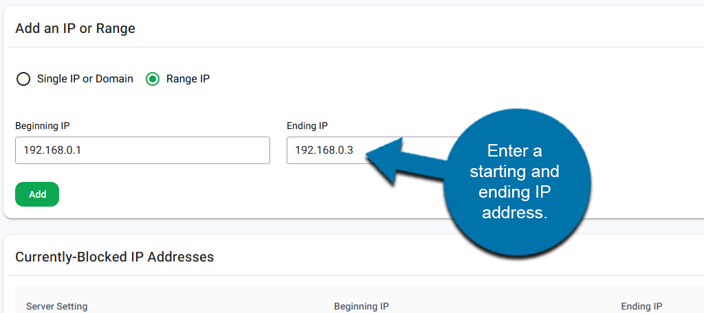 If you choose to block an IP range, enter the starting IP address and then the ending IP address in the appropriate boxes. All IP addresses between these will be blocked.