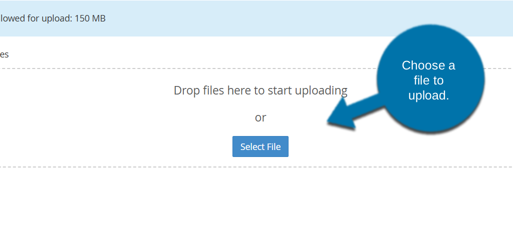 A new browser tab will open for file upload. Drag and drop the file to be uploaded, or click the “Select File” button.