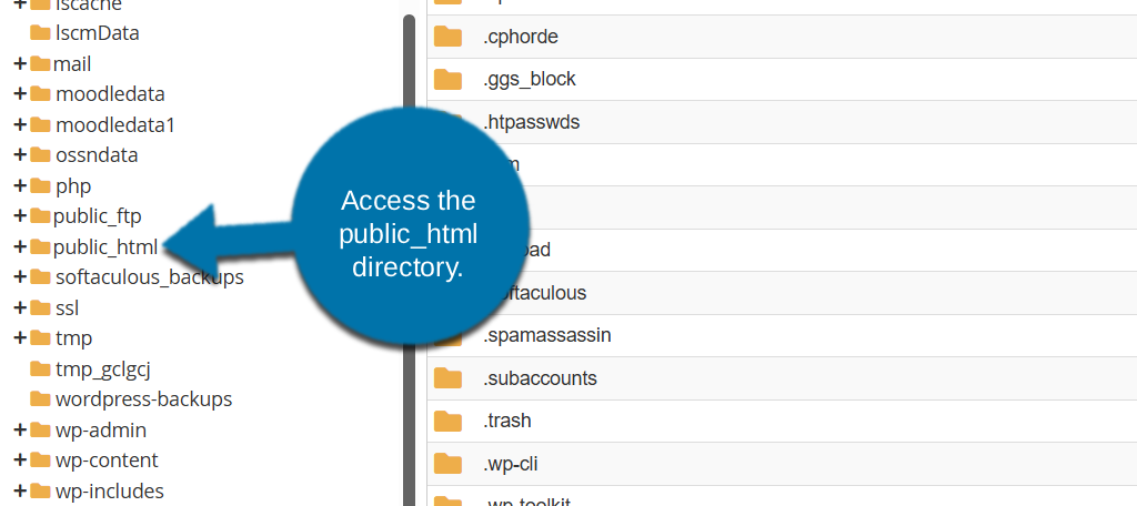 When you log in to the File Manager, you will be in the root directory for your account. Most of the time, you’ll be working with website files, and they are located in the “public_html” directory.