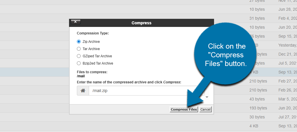 You will then be asked the compression type. Choose the Zip Archive option and click on the “Compress Files” button.