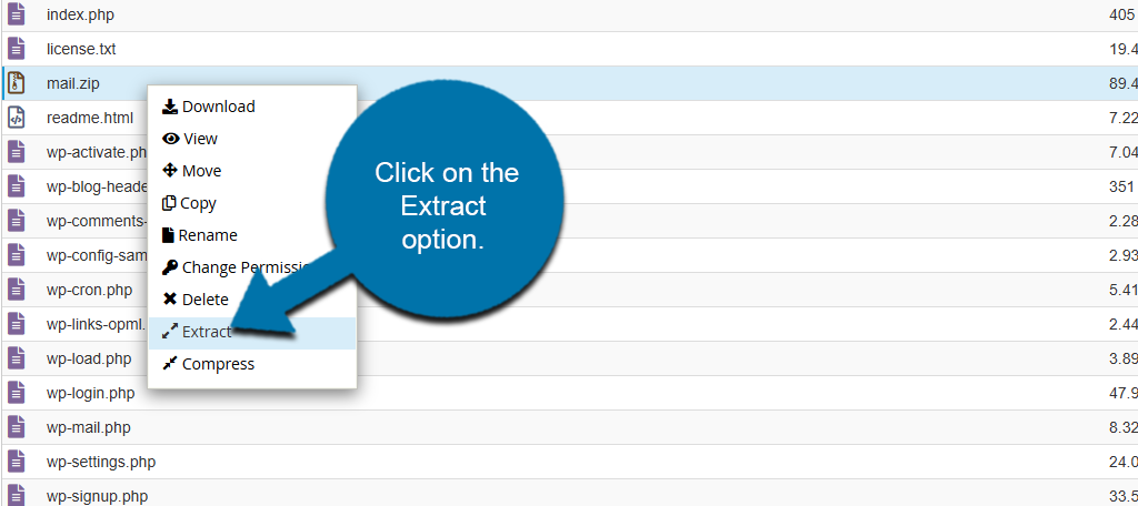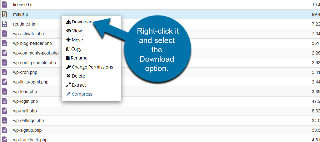 Once the process is complete, you will see a results screen that lists all of the files that were compressed. Reload the File Manager and locate the mail.zip file you just created. Right-click it and select the Download option.