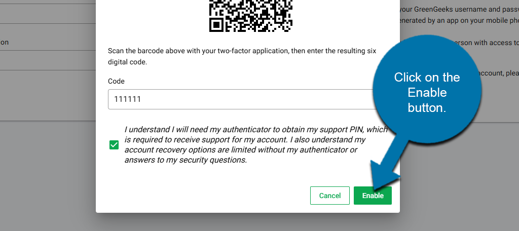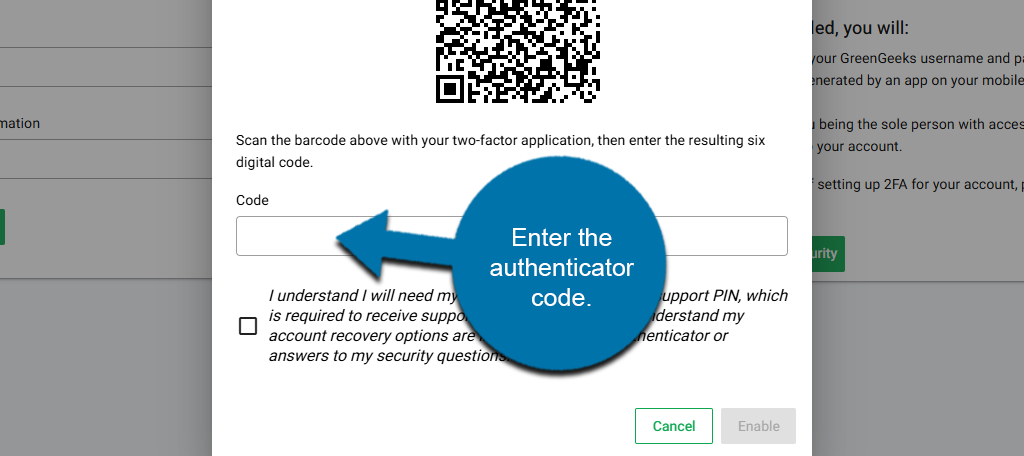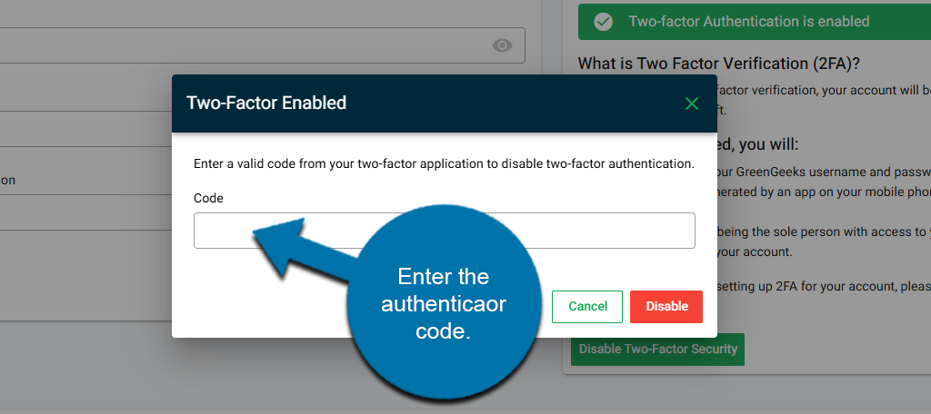 Your GreenGeeks account will be added to your authenticator app, which will now generate authenticator codes. Enter the one it generates into the Code text box.