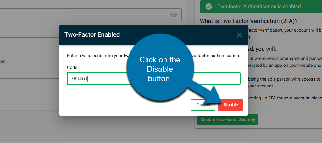 Return to the Security tab. Click on the Disable Two-Factor Security button.