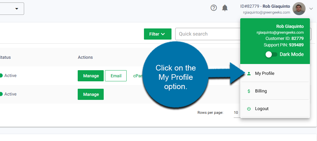 Log in to GreenGeeks. On the top right, click on your profile information in the top right corner. In the drop-down that opens, click on the My Profile option.