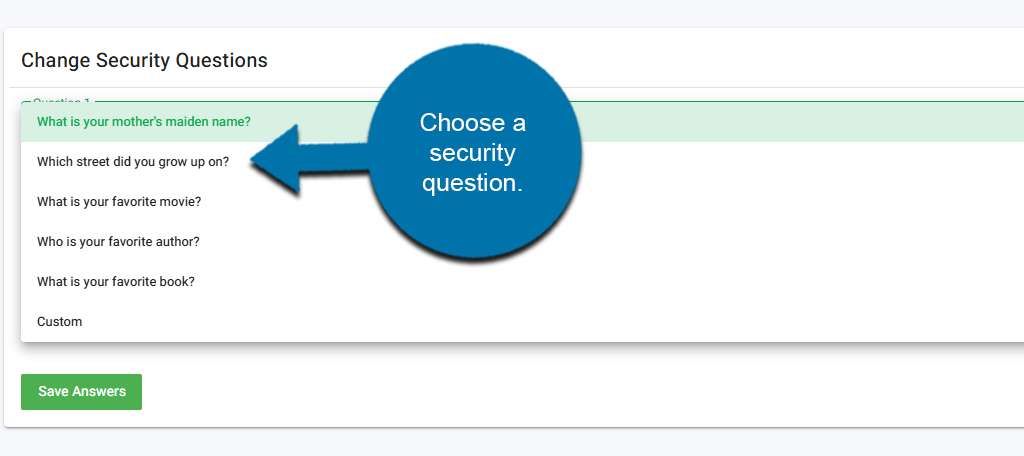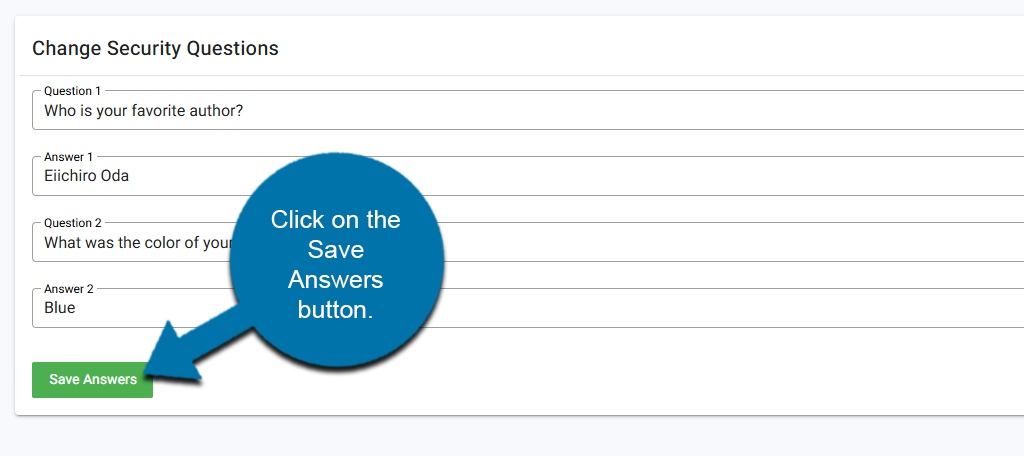 Enter the answer to your question in the following box. Repeat this for the second security question. Click on the Save Answers button when you are done.