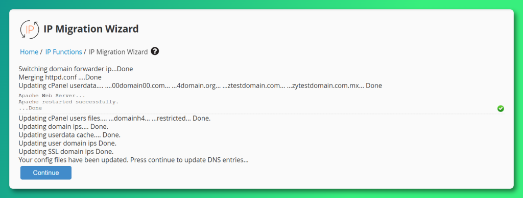 Step 6: Once the Config updates are complete, click “Continue” to begin the DNS Zone updates.