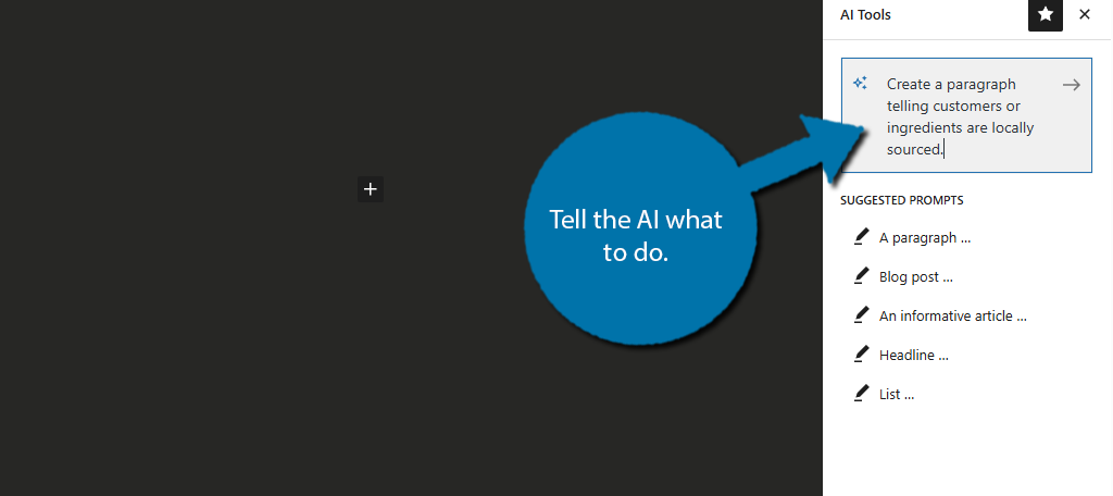 In this tutorial, I will briefly cover what is possible with this tool. And just to reiterate, this tool is for generative content. It cannot perform any maintenance, install a plugin for you, or do things of that nature. It can only generate text and images based on what you enter.