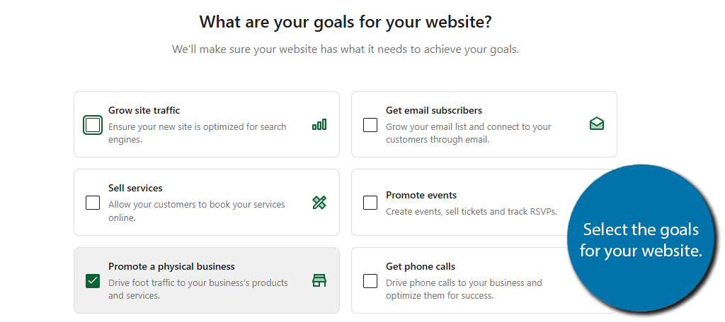 Next, you’ll need to tell the AI what your goals for the website are. There are several options, and you can choose multiple. Simply pick the ones that best reflect what you intend to do with the site.